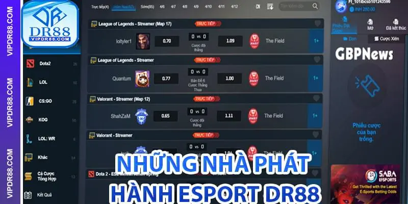 Saba Esport là một trong những nhà phát hành lớn nhất tại DR88, chuyên cung cấp các sản phẩm Esport từ những tựa game nổi tiếng nhất thế giới. Với Saba Esport, người chơi có thể tham gia vào các giải đấu của các tựa game như League of Legends, Dota 2, CSGO, và nhiều game khác. Saba Esport nổi bật với các tỷ lệ cược hấp dẫn và cung cấp những tính năng cá cược đa dạng, từ cược kết quả trận đấu cho đến các cược phức tạp hơn như cược kèo tài xỉu.
