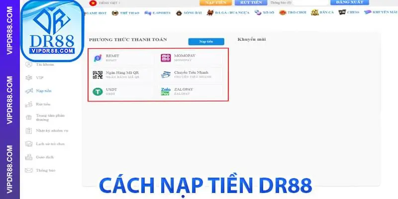 - Truy cập vào trang nạp tiền của DR88 : Sau khi đăng nhập vào tài khoản, bạn vào mục “Nạp tiền” trên trang chủ.